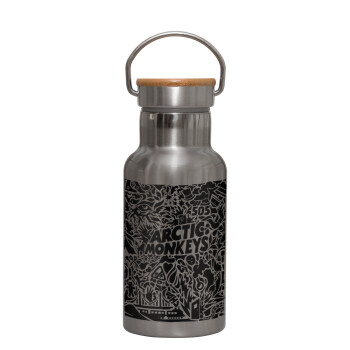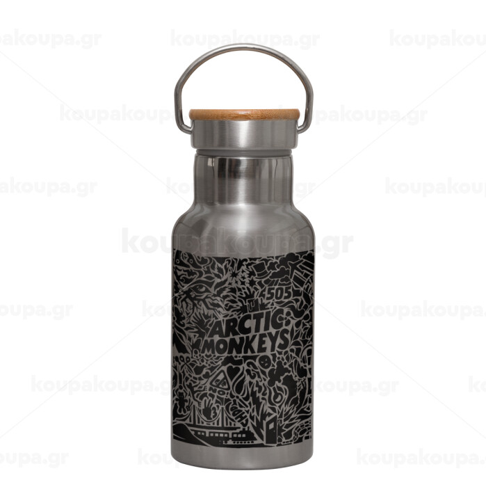 Arctic Monkeys, Stainless steel metallic thermos flask, silver with a bamboo lid, double-walled, 350ml.