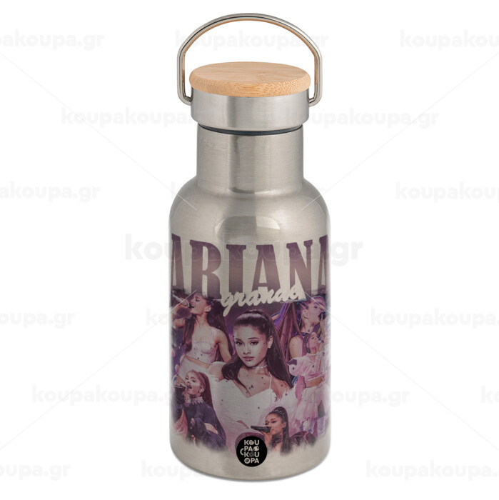 Ariana Grande, Stainless steel metallic thermos flask, silver with a bamboo lid, double-walled, 350ml.
