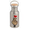 Korean Finger Heart, Stainless steel metallic thermos flask, silver with a bamboo lid, double-walled, 350ml.