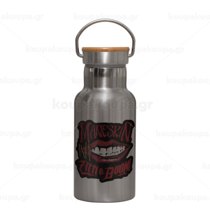 Maneskin lips, Stainless steel metallic thermos flask, silver with a bamboo lid, double-walled, 350ml.