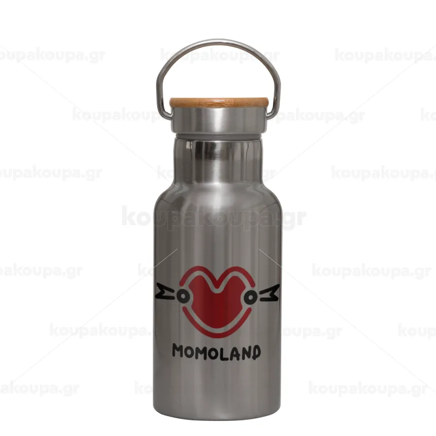Momoland, Stainless steel metallic thermos flask, silver with a bamboo lid, double-walled, 350ml.