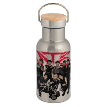 Stray Kids k-pop band, Stainless steel metallic thermos flask, silver with a bamboo lid, double-walled, 350ml.