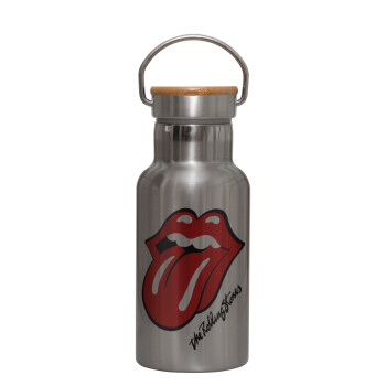 The rolling stones, Stainless steel metallic thermos flask, silver with a bamboo lid, double-walled, 350ml.