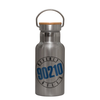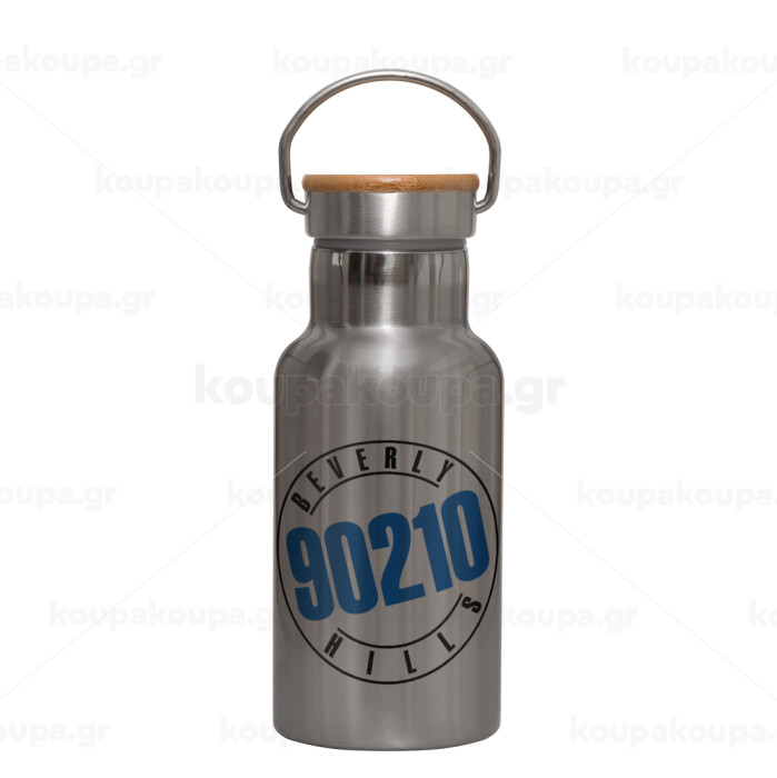 Beverly Hills, 90210, Stainless steel metallic thermos flask, silver with a bamboo lid, double-walled, 350ml.