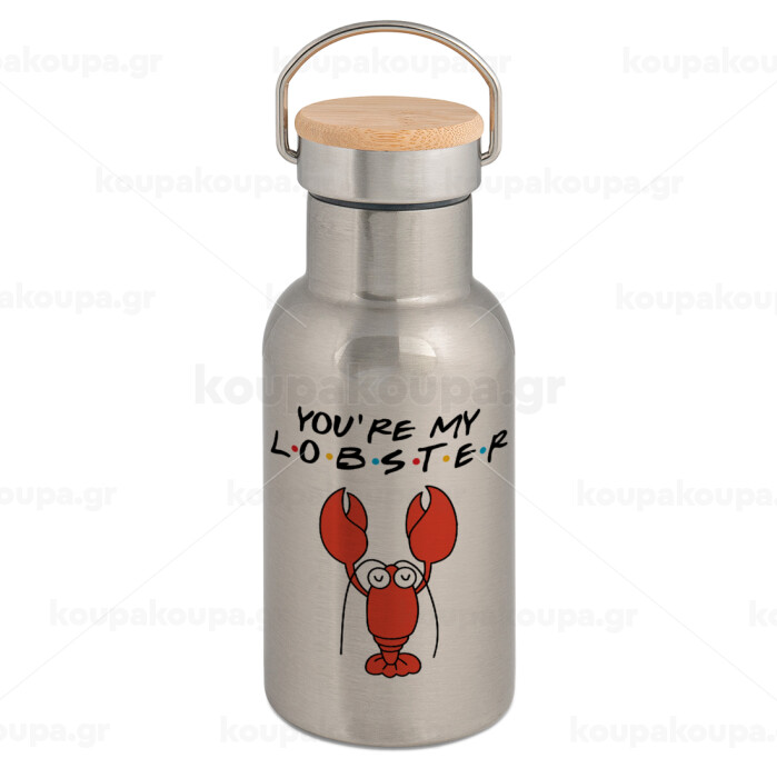 Friends you're my lobster, Stainless steel metallic thermos flask, silver with a bamboo lid, double-walled, 350ml.