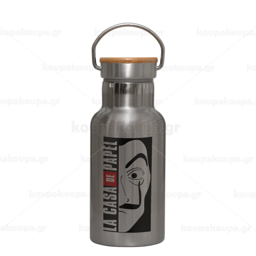 La casa de papel vertical, Stainless steel metallic thermos flask, silver with a bamboo lid, double-walled, 350ml.