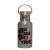 La casa de papel, Stainless steel metallic thermos flask, silver with a bamboo lid, double-walled, 350ml.