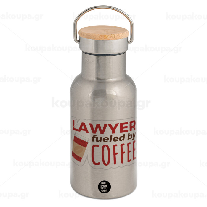 Lawyer fueled by coffee, Stainless steel metallic thermos flask, silver with a bamboo lid, double-walled, 350ml.