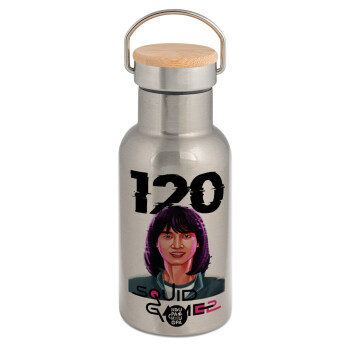 Squid game 120 Cho Hyun-ju, Stainless steel metallic thermos flask, silver with a bamboo lid, double-walled, 350ml.