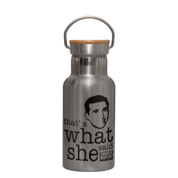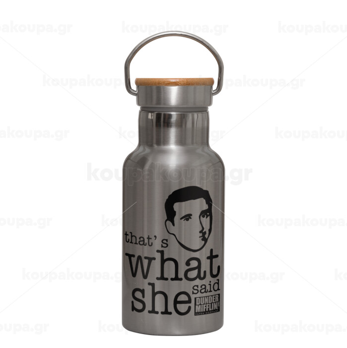 The office Michael That's what she said, Stainless steel metallic thermos flask, silver with a bamboo lid, double-walled, 350ml.