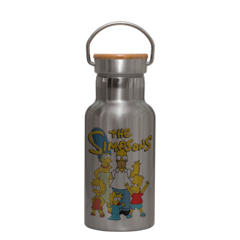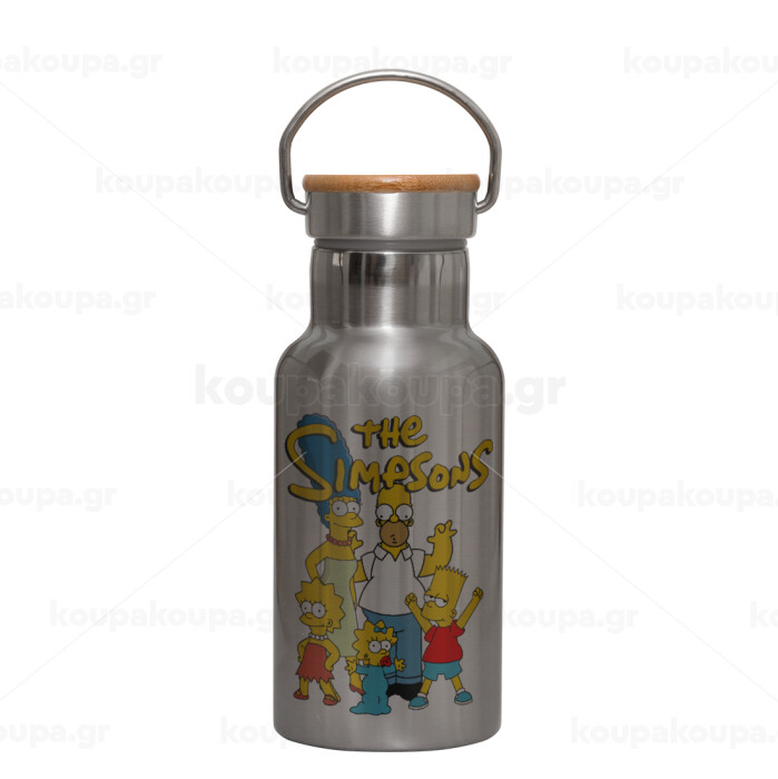 The Simpsons, Stainless steel metallic thermos flask, silver with a bamboo lid, double-walled, 350ml.