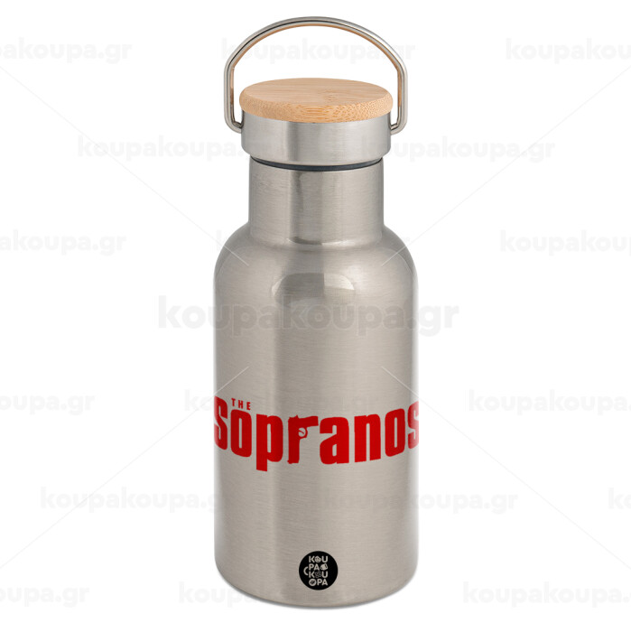 The Sopranos, Stainless steel metallic thermos flask, silver with a bamboo lid, double-walled, 350ml.