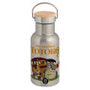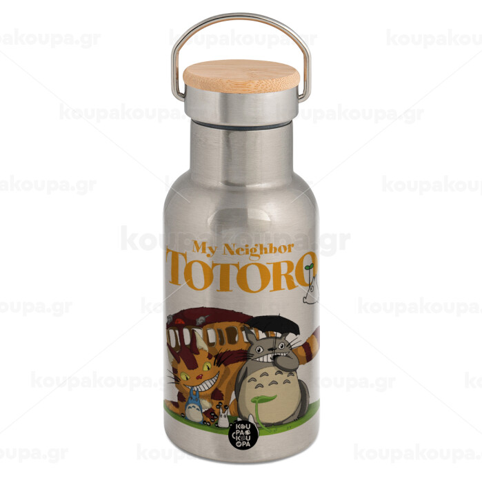 Totoro and Cat, Stainless steel metallic thermos flask, silver with a bamboo lid, double-walled, 350ml.