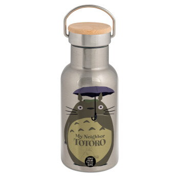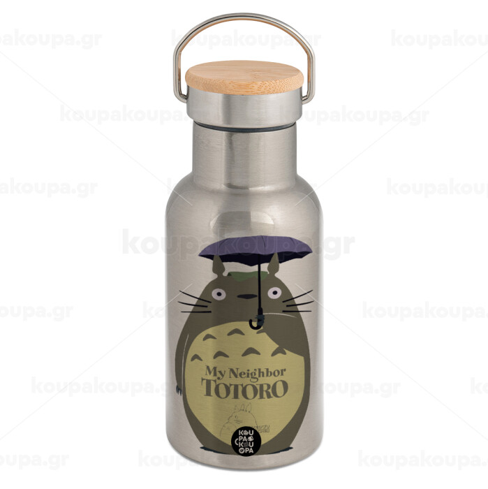 Totoro from My Neighbor Totoro, Stainless steel metallic thermos flask, silver with a bamboo lid, double-walled, 350ml.