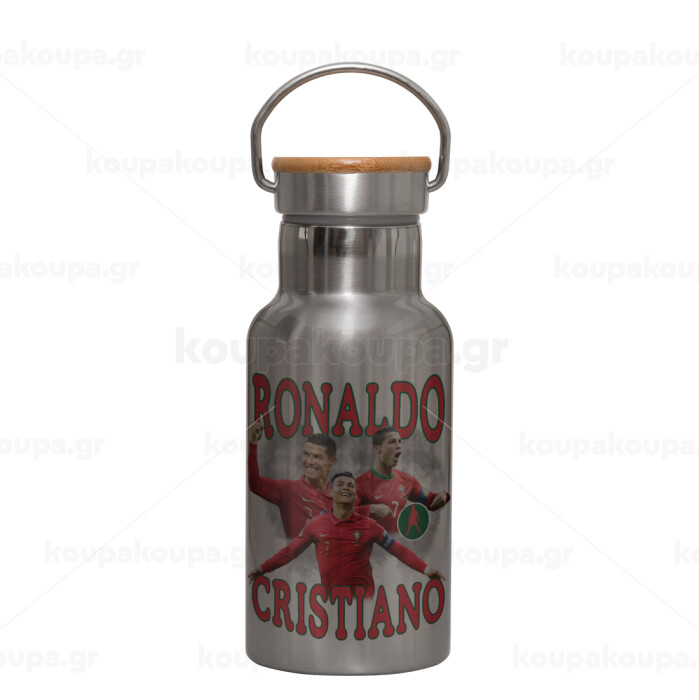 Cristiano Ronaldo, Stainless steel metallic thermos flask, silver with a bamboo lid, double-walled, 350ml.