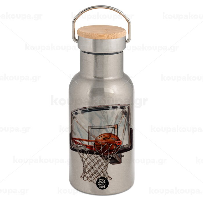 Basketball, Stainless steel metallic thermos flask, silver with a bamboo lid, double-walled, 350ml.
