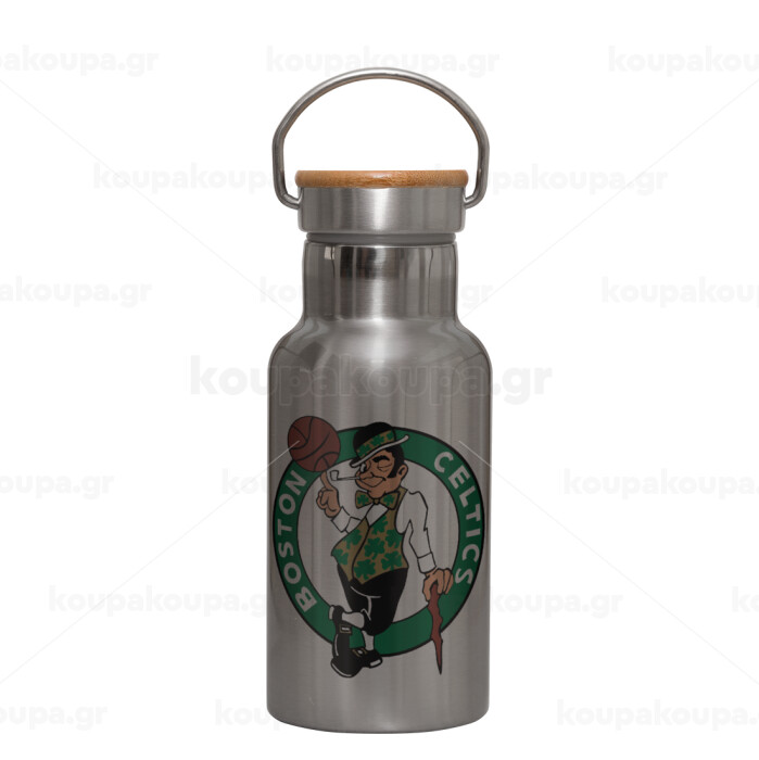 Boston Celtics, Stainless steel metallic thermos flask, silver with a bamboo lid, double-walled, 350ml.