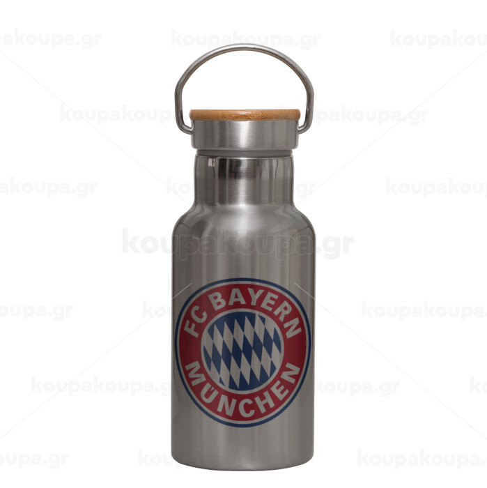 FC Bayern Munich, Stainless steel metallic thermos flask, silver with a bamboo lid, double-walled, 350ml.
