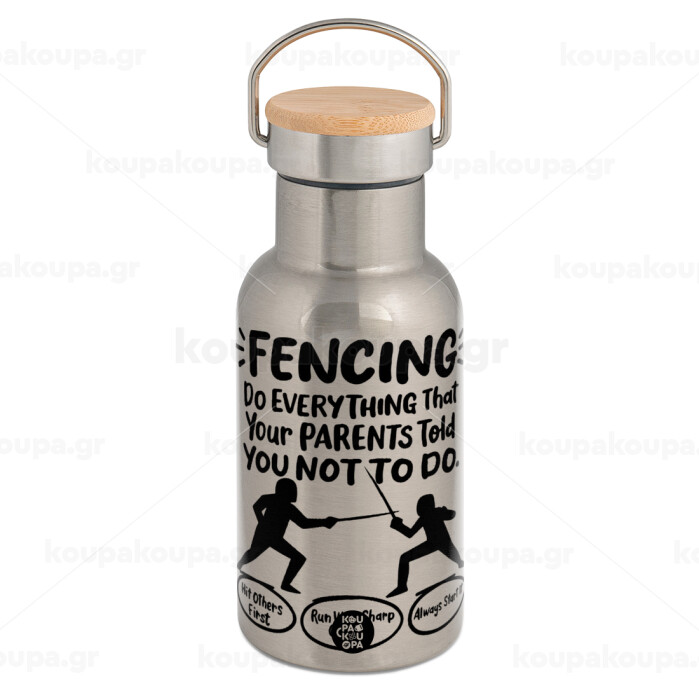 Fencing, do everything that your parents told you not to do., Stainless steel metallic thermos flask, silver with a bamboo lid, double-walled, 350ml.