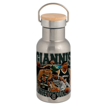 Giannis Antetokounmpo, Stainless steel metallic thermos flask, silver with a bamboo lid, double-walled, 350ml.