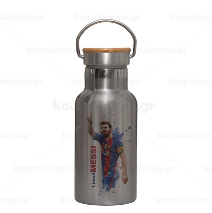 Lionel Messi, Stainless steel metallic thermos flask, silver with a bamboo lid, double-walled, 350ml.