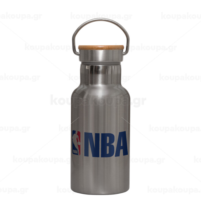NBA, Stainless steel metallic thermos flask, silver with a bamboo lid, double-walled, 350ml.