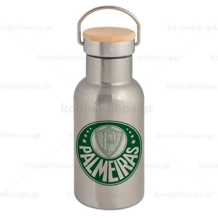 Palmeiras, Stainless steel metallic thermos flask, silver with a bamboo lid, double-walled, 350ml.