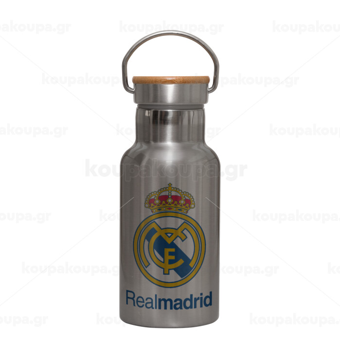 Real Madrid CF, Stainless steel metallic thermos flask, silver with a bamboo lid, double-walled, 350ml.