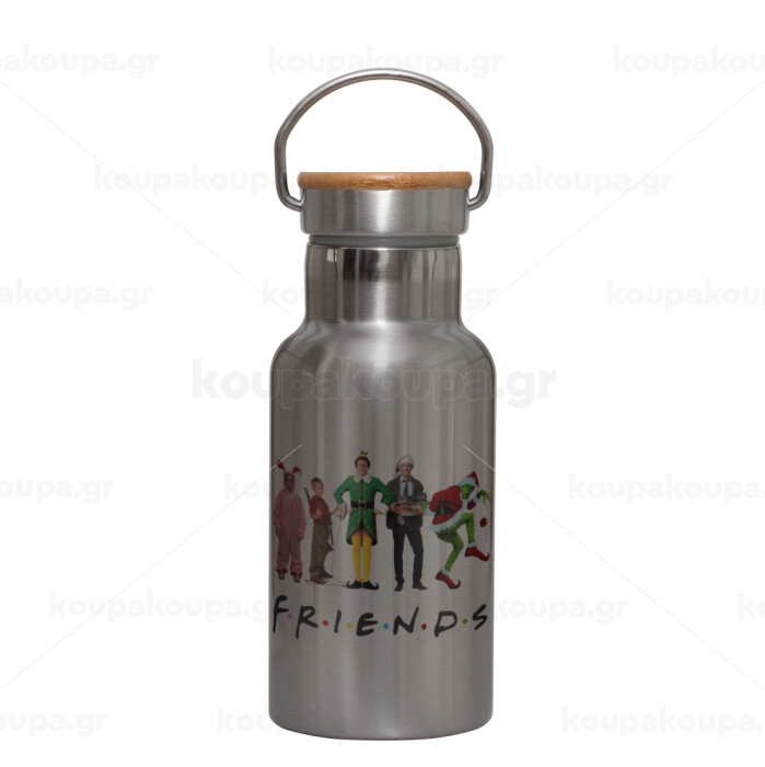 Christmas FRIENDS, Stainless steel metallic thermos flask, silver with a bamboo lid, double-walled, 350ml.