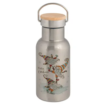 Christmas nordic gnomes, Stainless steel metallic thermos flask, silver with a bamboo lid, double-walled, 350ml.