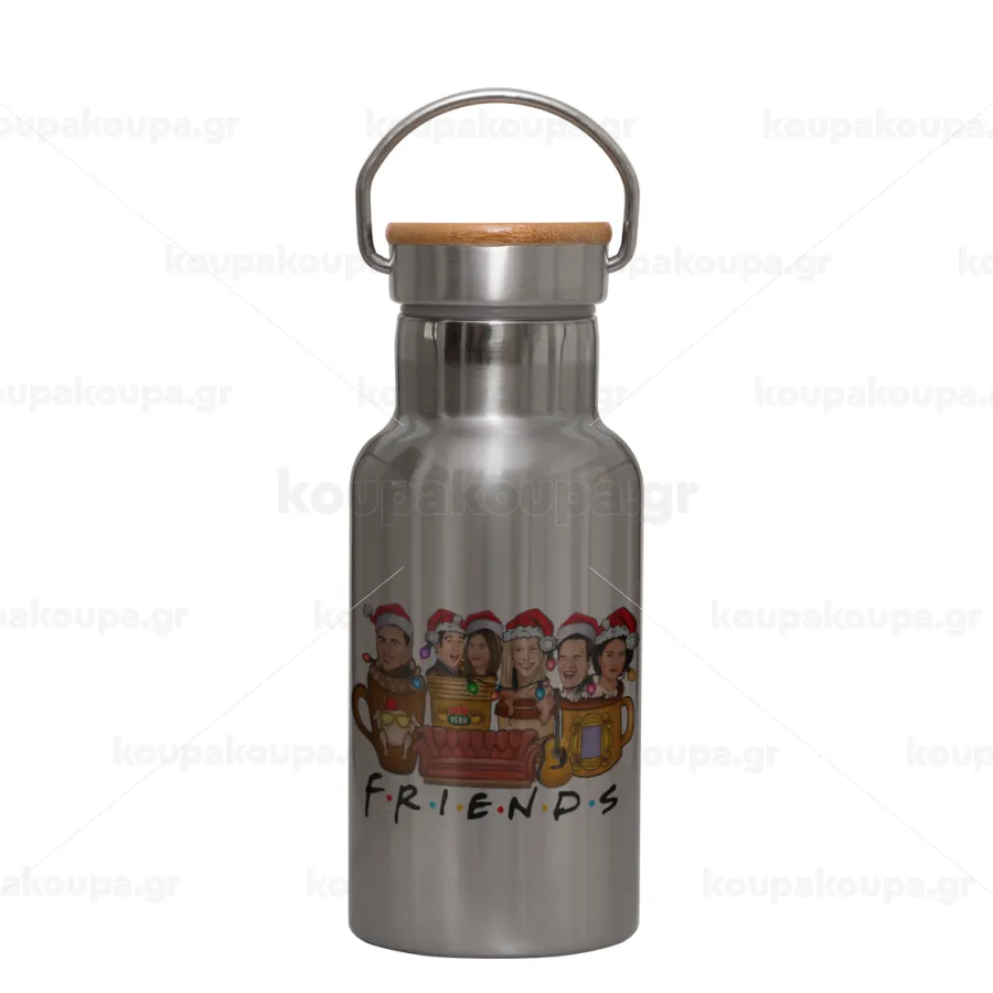 FRIENDS xmas, Stainless steel metallic thermos flask, silver with a bamboo lid, double-walled, 350ml.