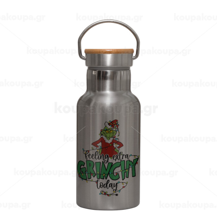 Grinch Feeling Extra Grinchy Today, Stainless steel metallic thermos flask, silver with a bamboo lid, double-walled, 350ml.