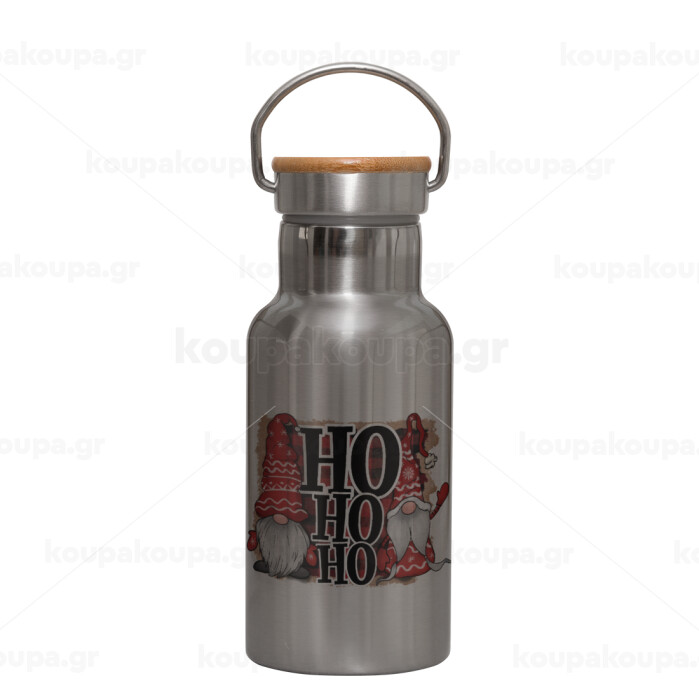 Ho ho ho, Stainless steel metallic thermos flask, silver with a bamboo lid, double-walled, 350ml.