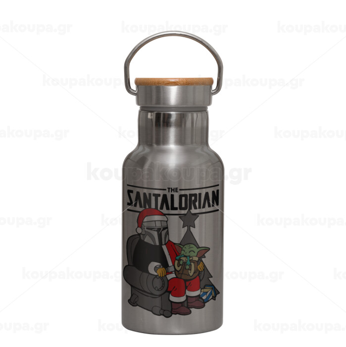 Star Wars Santalorian, Stainless steel metallic thermos flask, silver with a bamboo lid, double-walled, 350ml.
