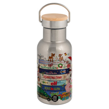 Xmas Classic movies, Stainless steel metallic thermos flask, silver with a bamboo lid, double-walled, 350ml.
