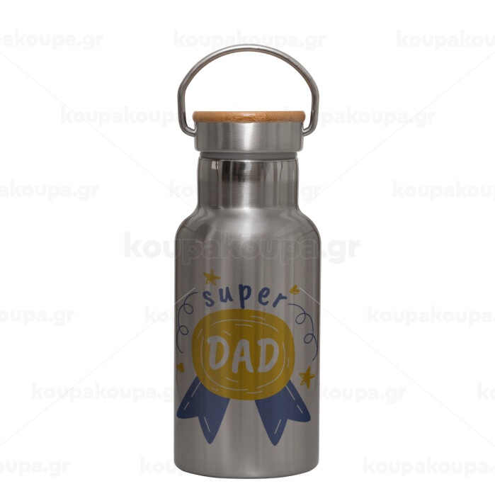 Μπαμπά είσαι για μετάλλιο, Stainless steel metallic thermos flask, silver with a bamboo lid, double-walled, 350ml.