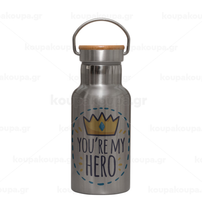 Dad, you are my hero!, Stainless steel metallic thermos flask, silver with a bamboo lid, double-walled, 350ml.