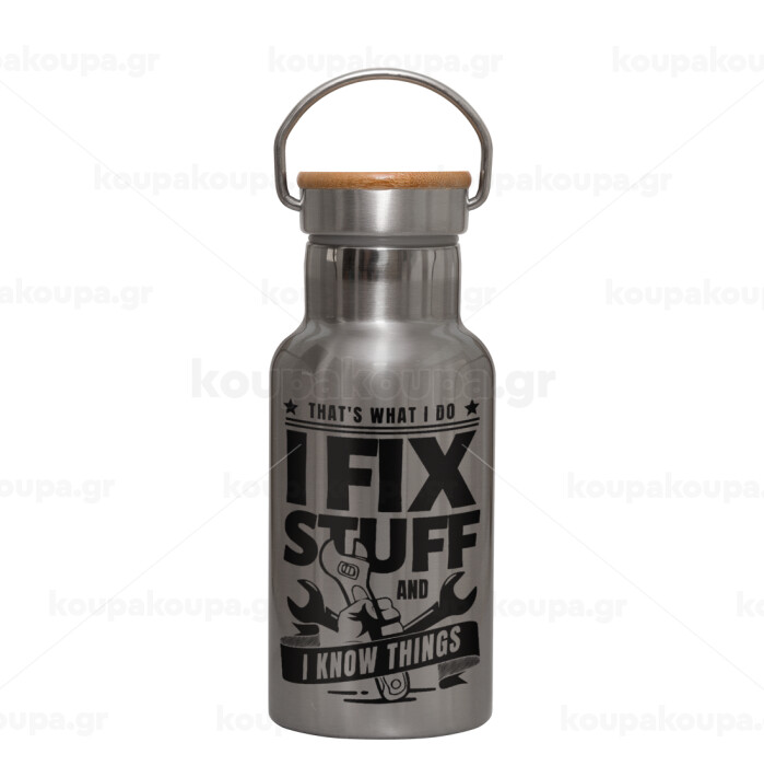 I fix stuff, Stainless steel metallic thermos flask, silver with a bamboo lid, double-walled, 350ml.