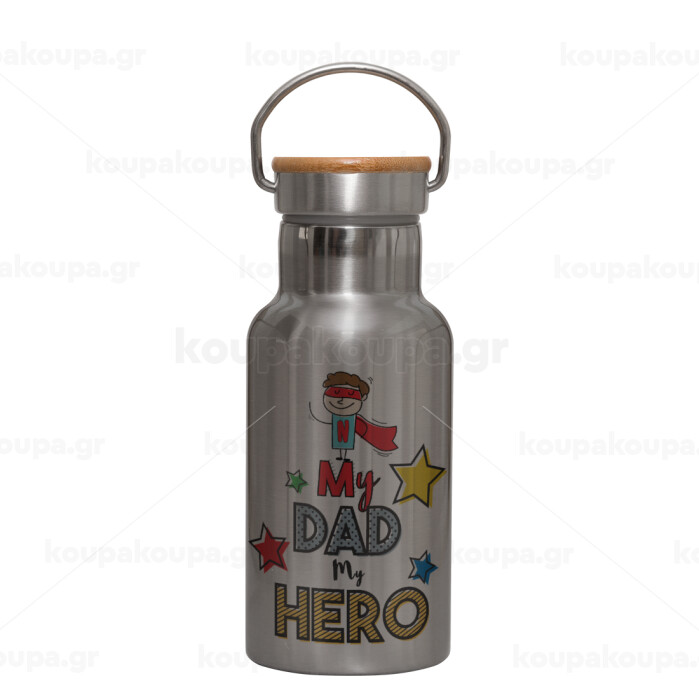 My Dad, my Hero!!!, Stainless steel metallic thermos flask, silver with a bamboo lid, double-walled, 350ml.