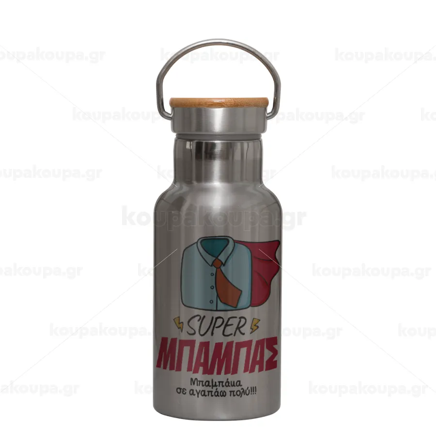 SUPER ΜΠΑΜΠΑΣ, Stainless steel metallic thermos flask, silver with a bamboo lid, double-walled, 350ml.