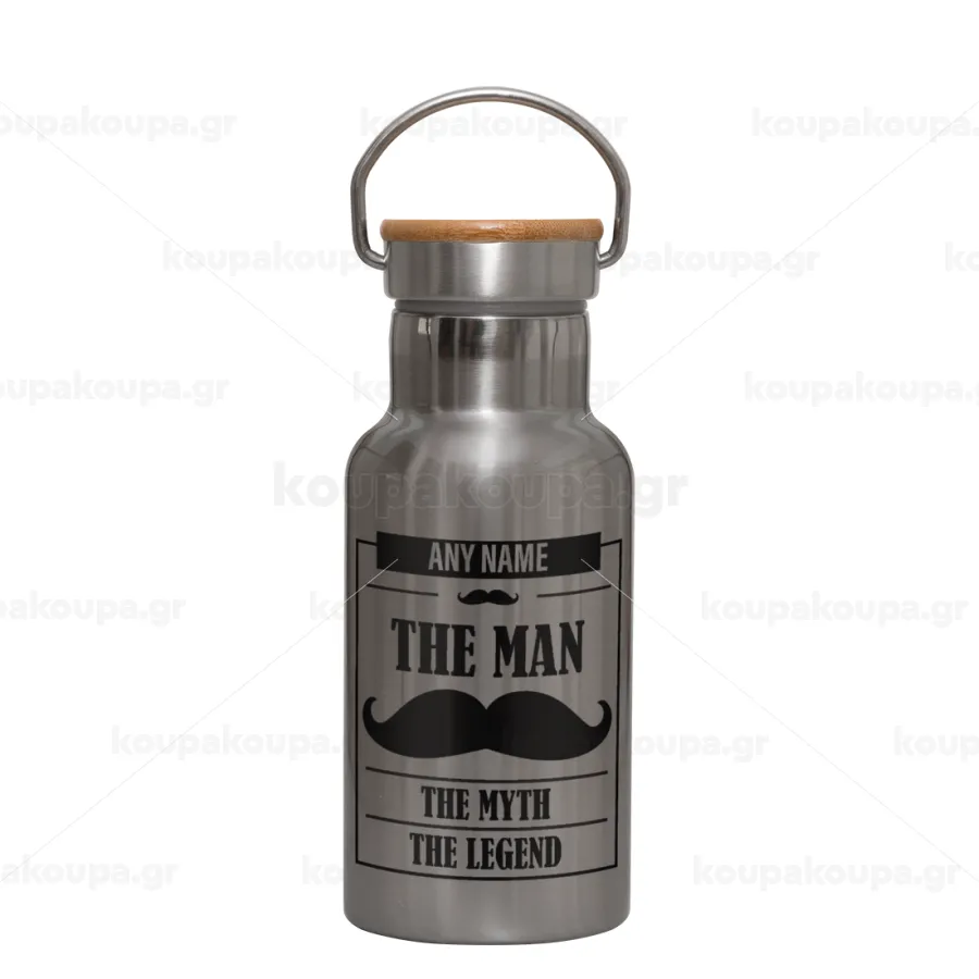 The man, the myth, Stainless steel metallic thermos flask, silver with a bamboo lid, double-walled, 350ml.