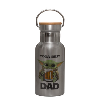 Yoda Best Dad, Stainless steel metallic thermos flask, silver with a bamboo lid, double-walled, 350ml.