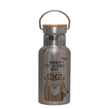 Παππού σε αγαπώ πολύ!, Stainless steel metallic thermos flask, silver with a bamboo lid, double-walled, 350ml.