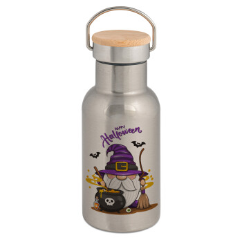 Happy Halloween (Χαλοουίν), Stainless steel metallic thermos flask, silver with a bamboo lid, double-walled, 350ml.