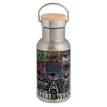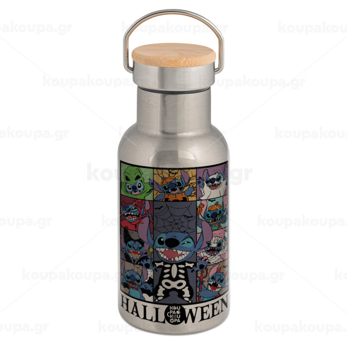 Stitch Halloween, Stainless steel metallic thermos flask, silver with a bamboo lid, double-walled, 350ml.