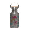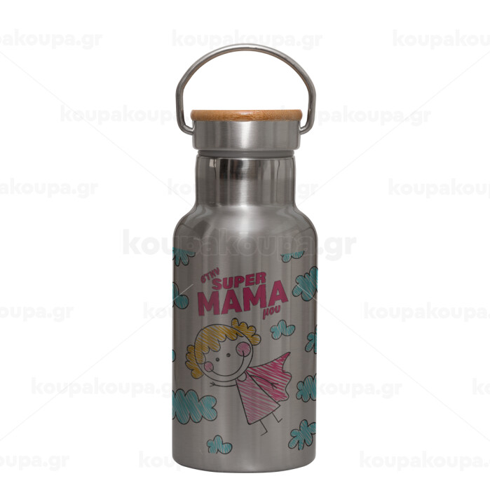 Στην SUPER μαμά μου, comic, Stainless steel metallic thermos flask, silver with a bamboo lid, double-walled, 350ml.