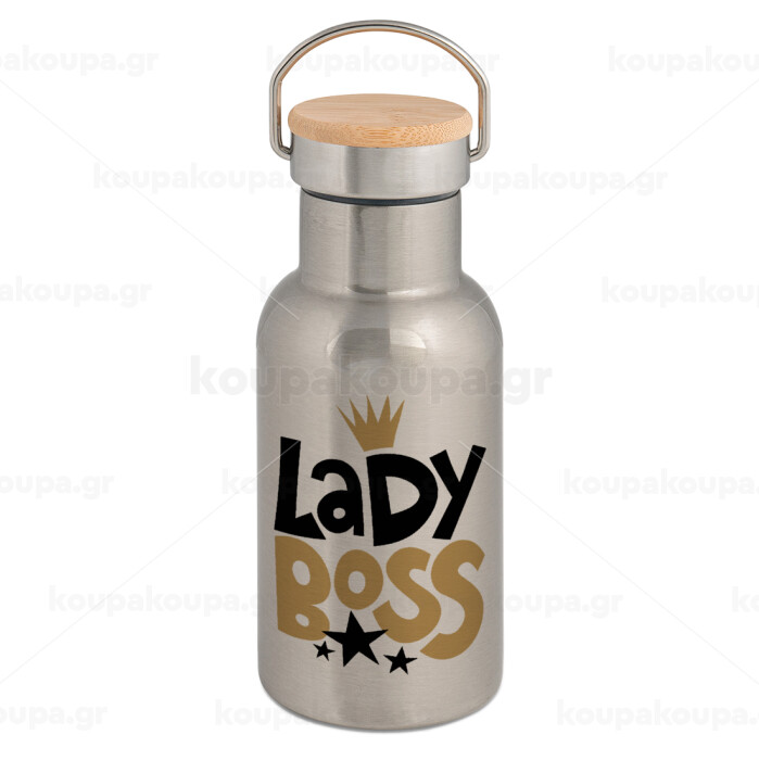 Lady Boss, Stainless steel metallic thermos flask, silver with a bamboo lid, double-walled, 350ml.