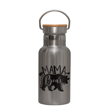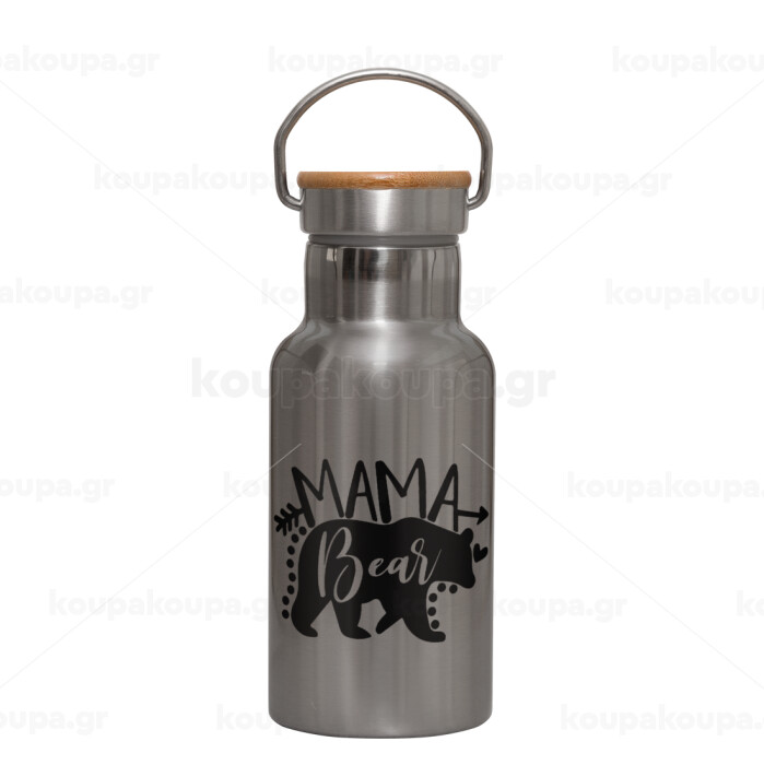 Mama Bear, Stainless steel metallic thermos flask, silver with a bamboo lid, double-walled, 350ml.