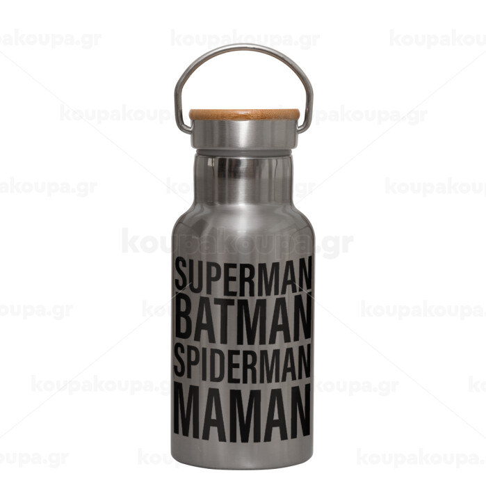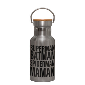 MAMAN, Stainless steel metallic thermos flask, silver with a bamboo lid, double-walled, 350ml.