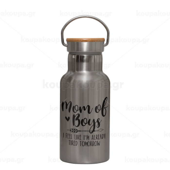 Mom of boys i feel like im already tired tomorrow, Stainless steel metallic thermos flask, silver with a bamboo lid, double-walled, 350ml.
